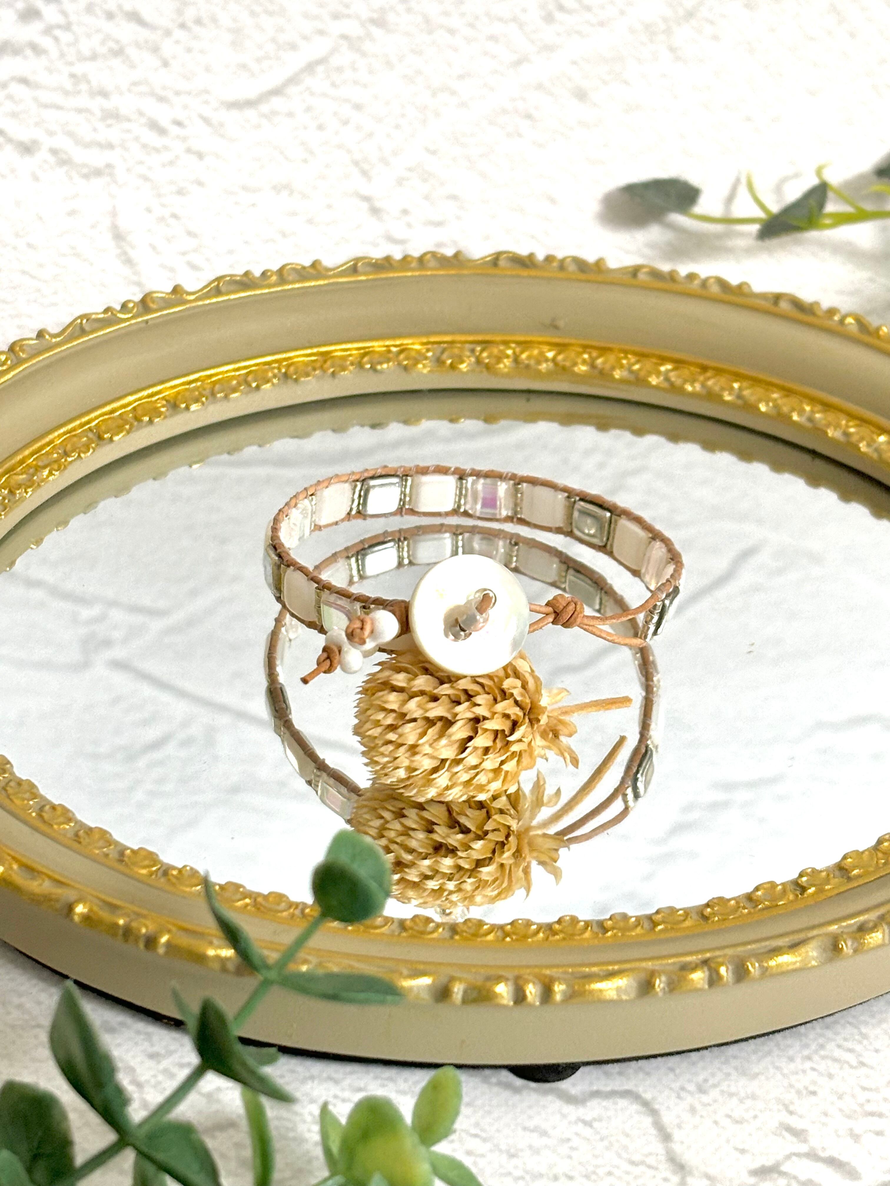 通常の1つ穴のビーズを使ったラップブレスレットに比べて、穴の数が3倍(!)という、手間暇と時間のかかる作品です。