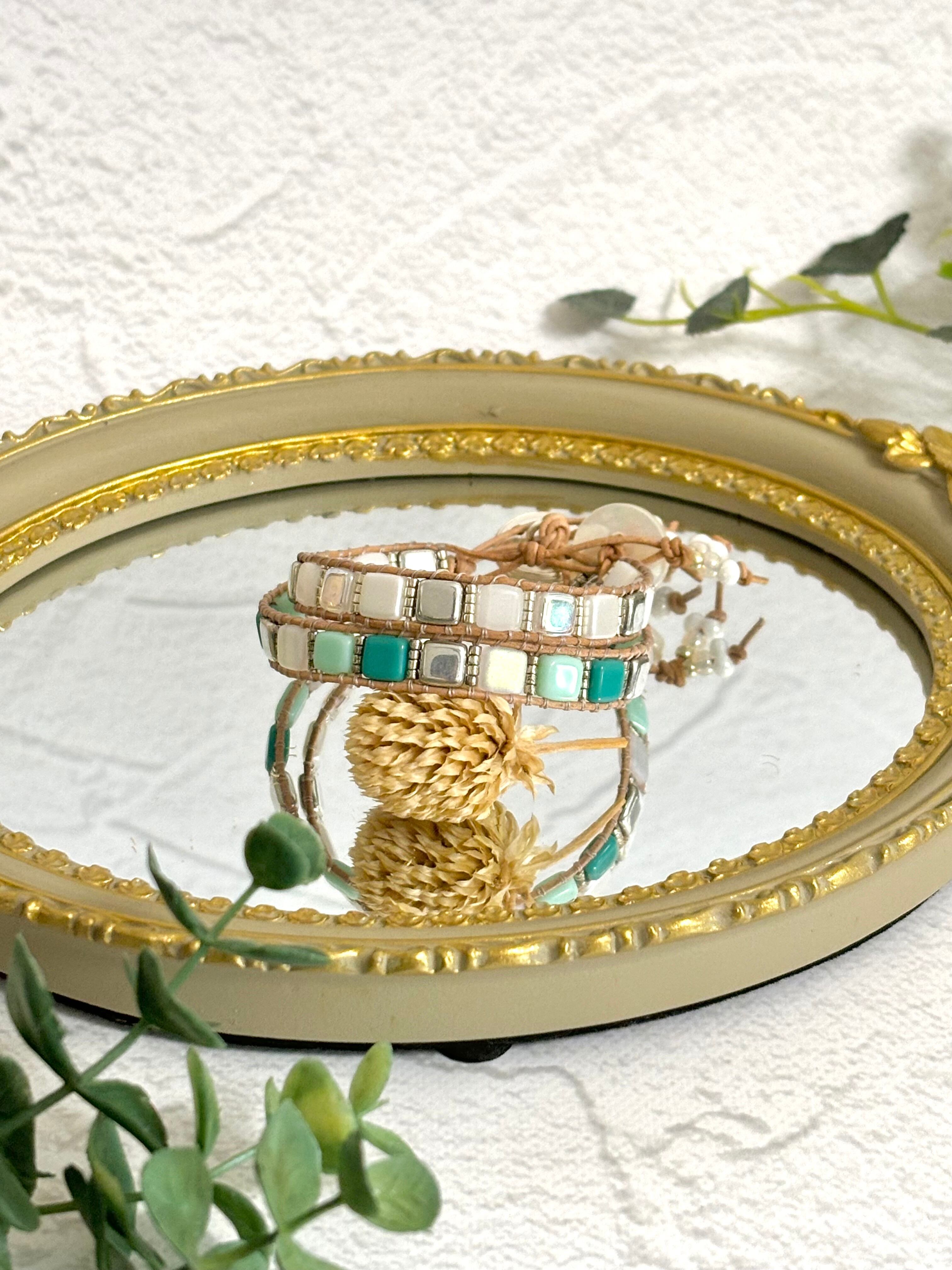 通常の1つ穴のビーズを使ったラップブレスレットに比べて、穴の数が3倍(!)という、手間暇と時間のかかる作品です。