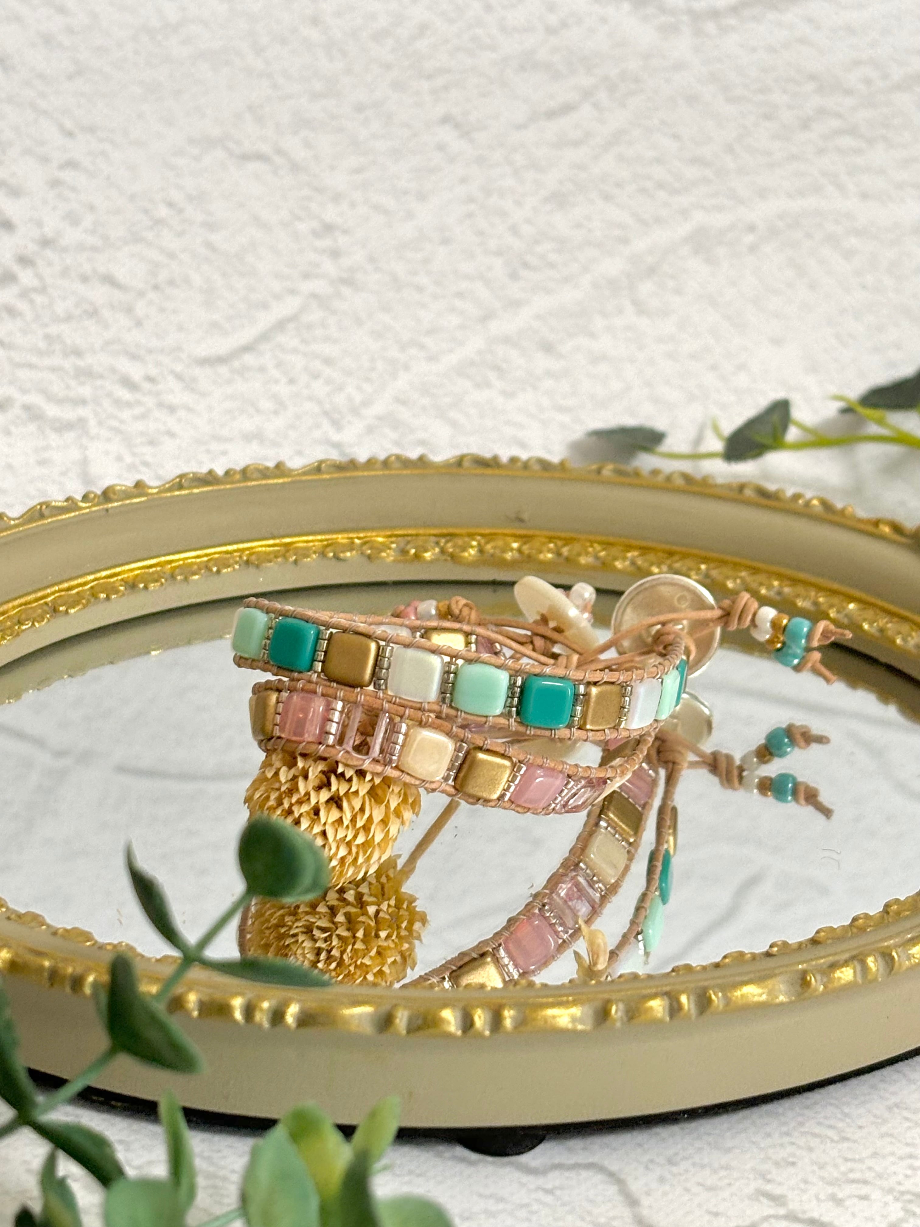 通常の1つ穴のビーズを使ったラップブレスレットに比べて、穴の数が3倍(!)という、手間暇と時間のかかる作品です。