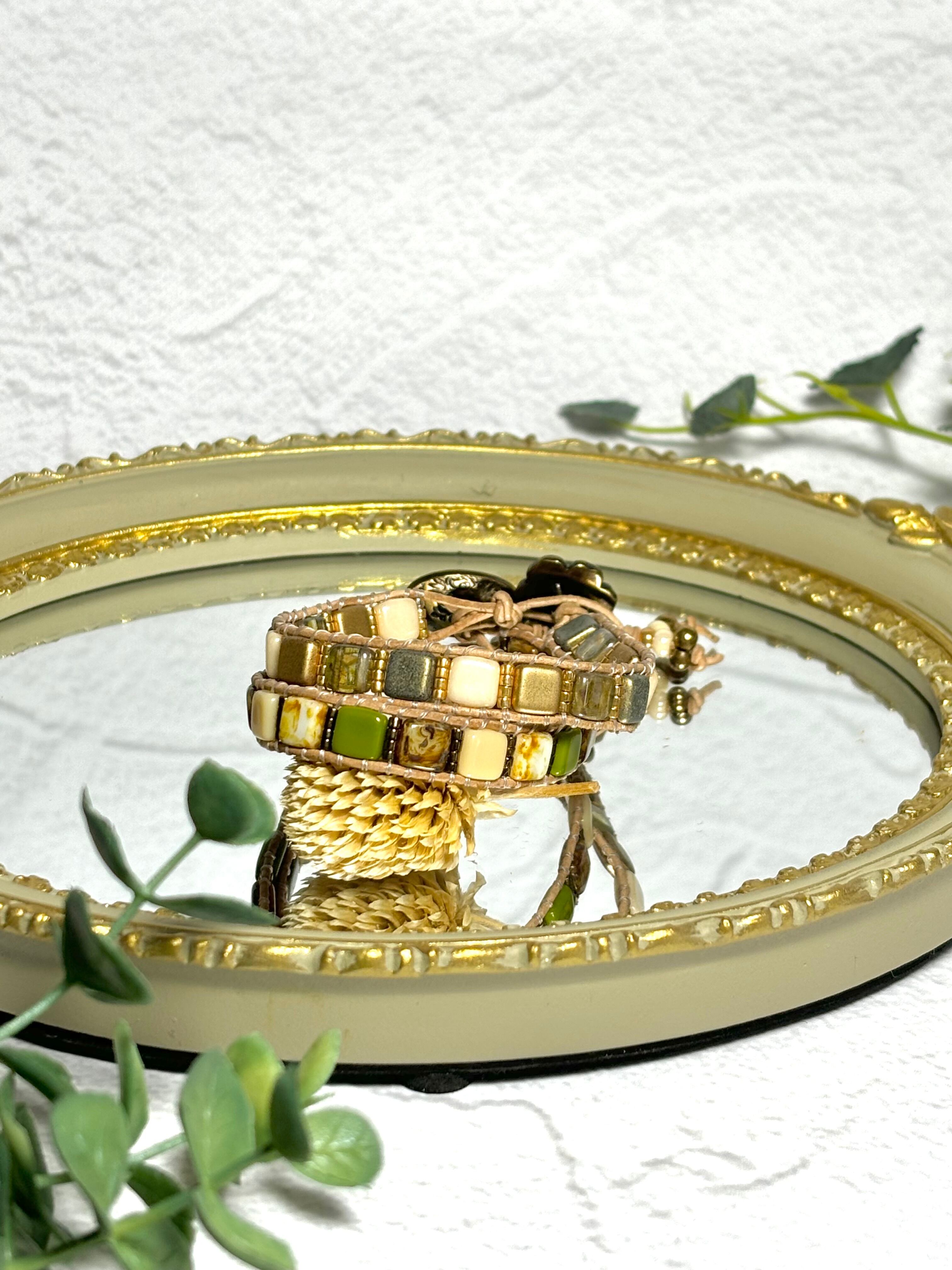 通常の1つ穴のビーズを使ったラップブレスレットに比べて、穴の数が3倍(!)という、手間暇と時間のかかる作品です。