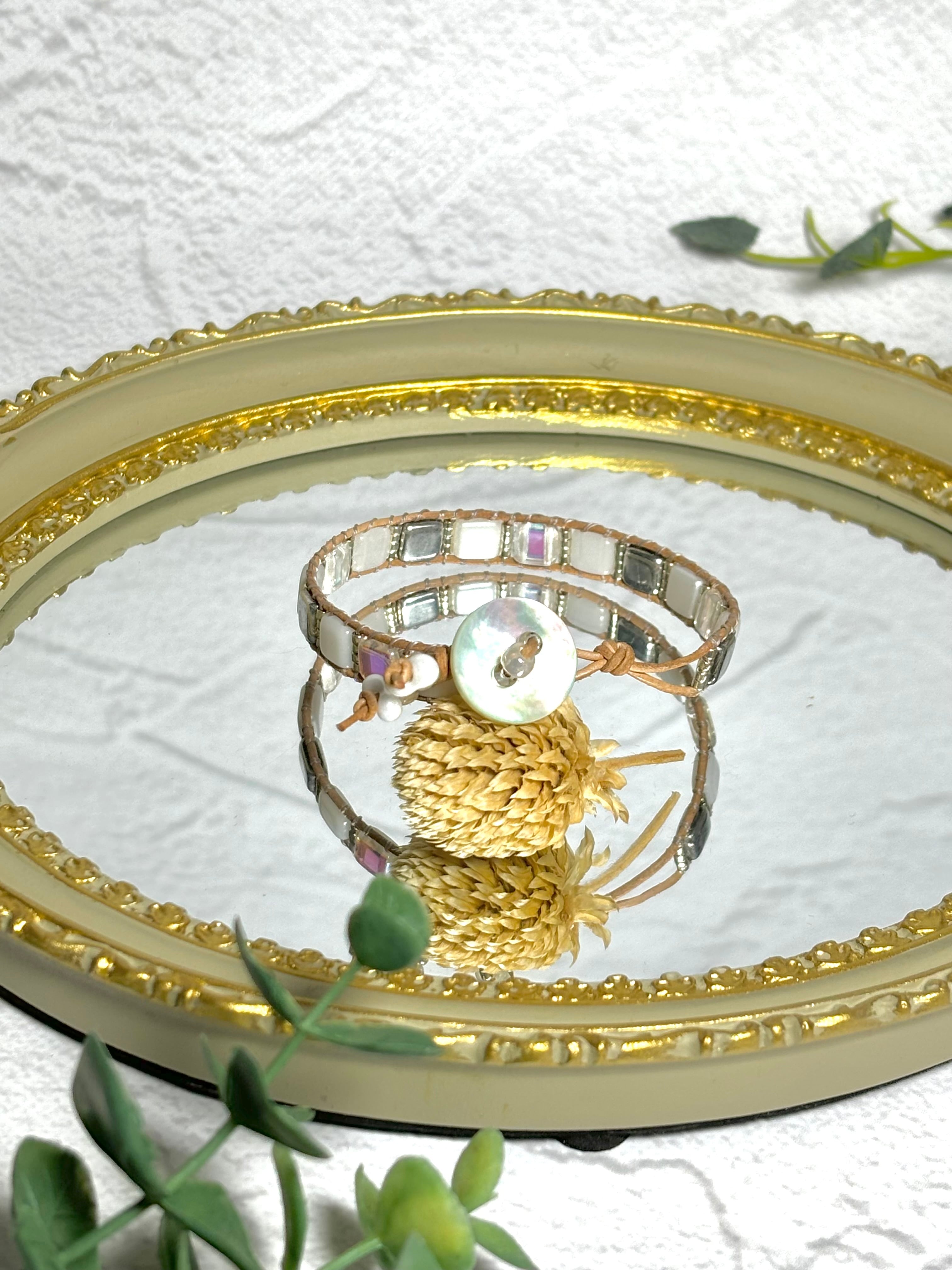 通常の1つ穴のビーズを使ったラップブレスレットに比べて、穴の数が3倍(!)という、手間暇と時間のかかる作品です。
