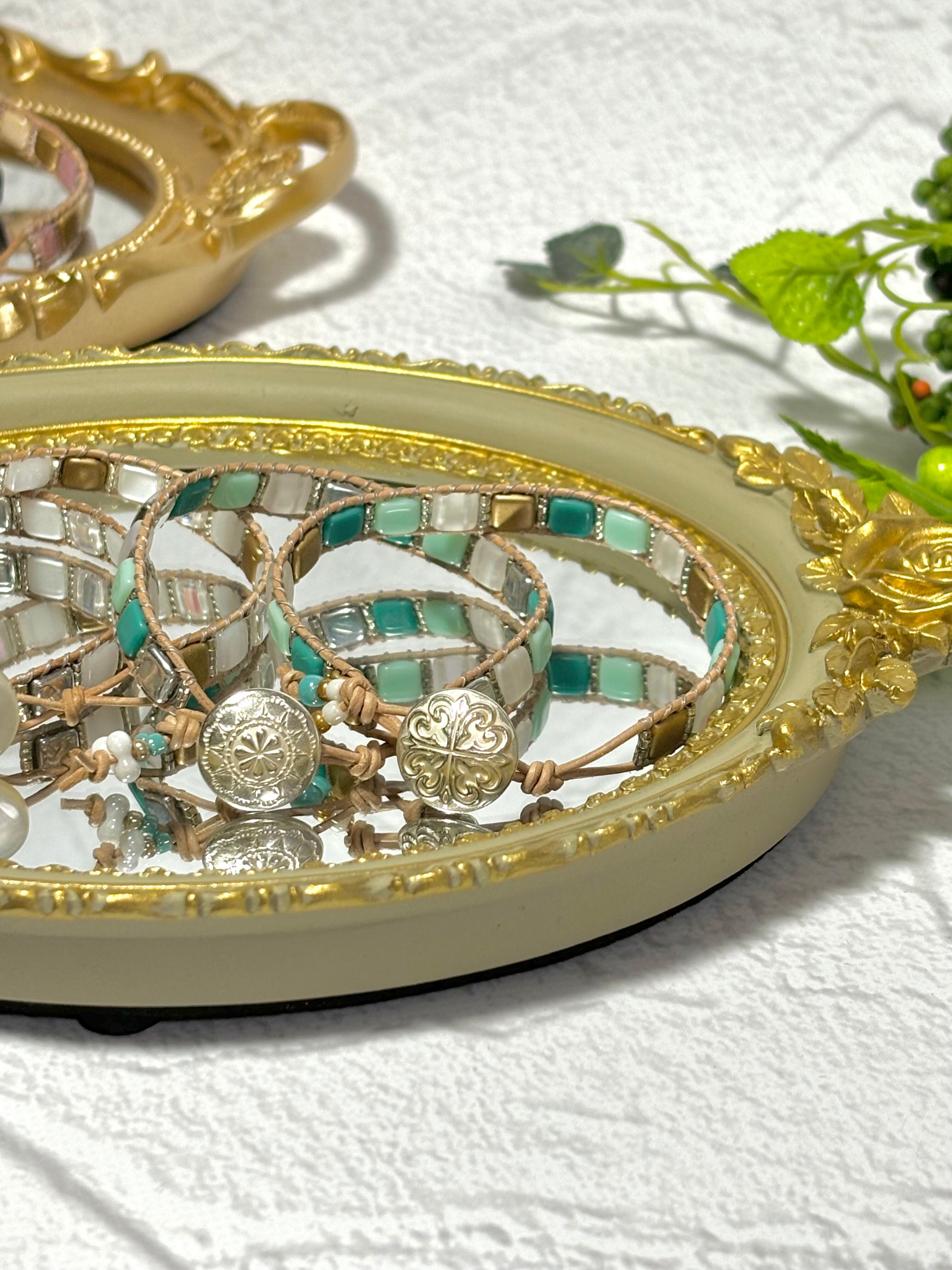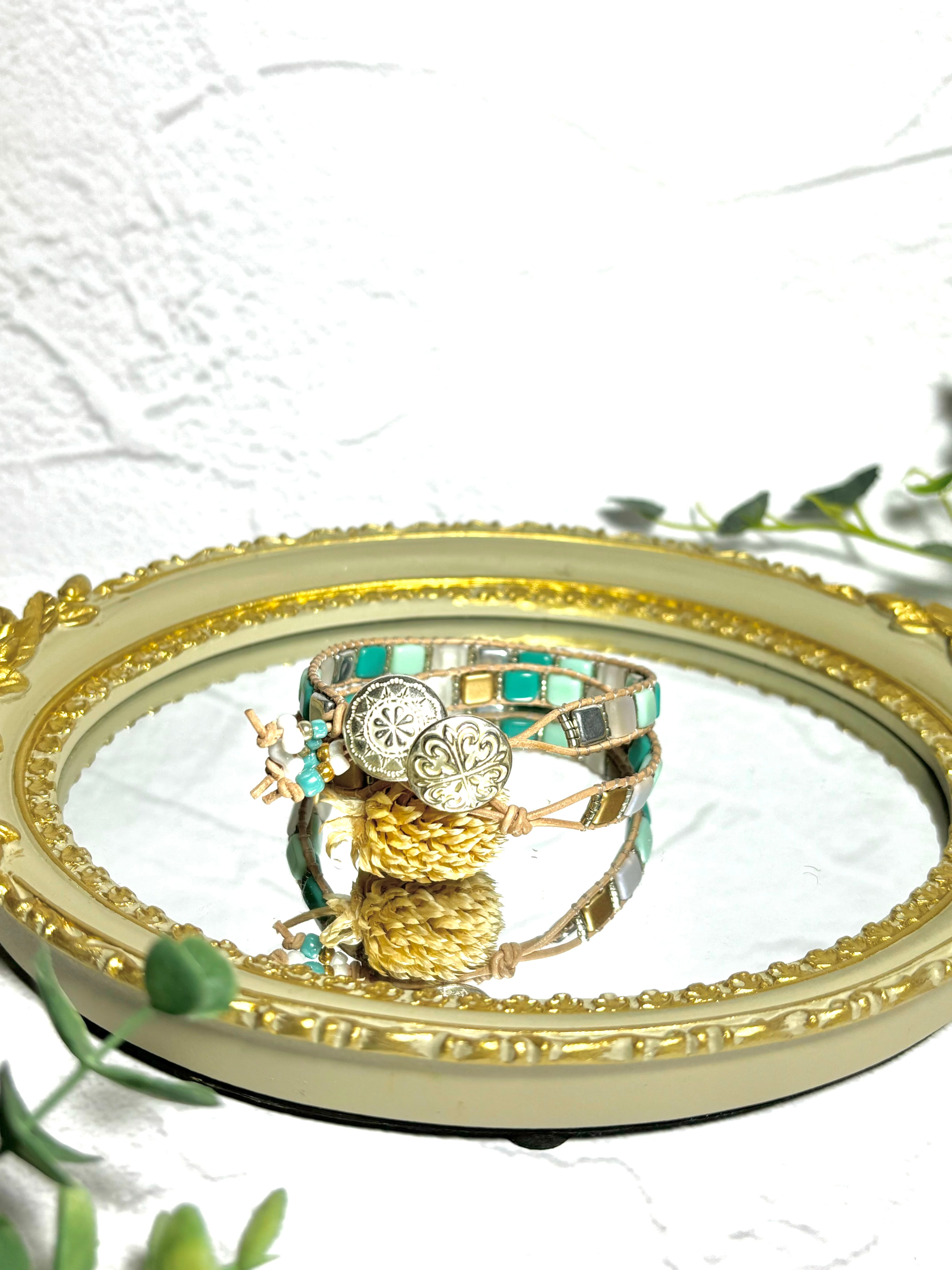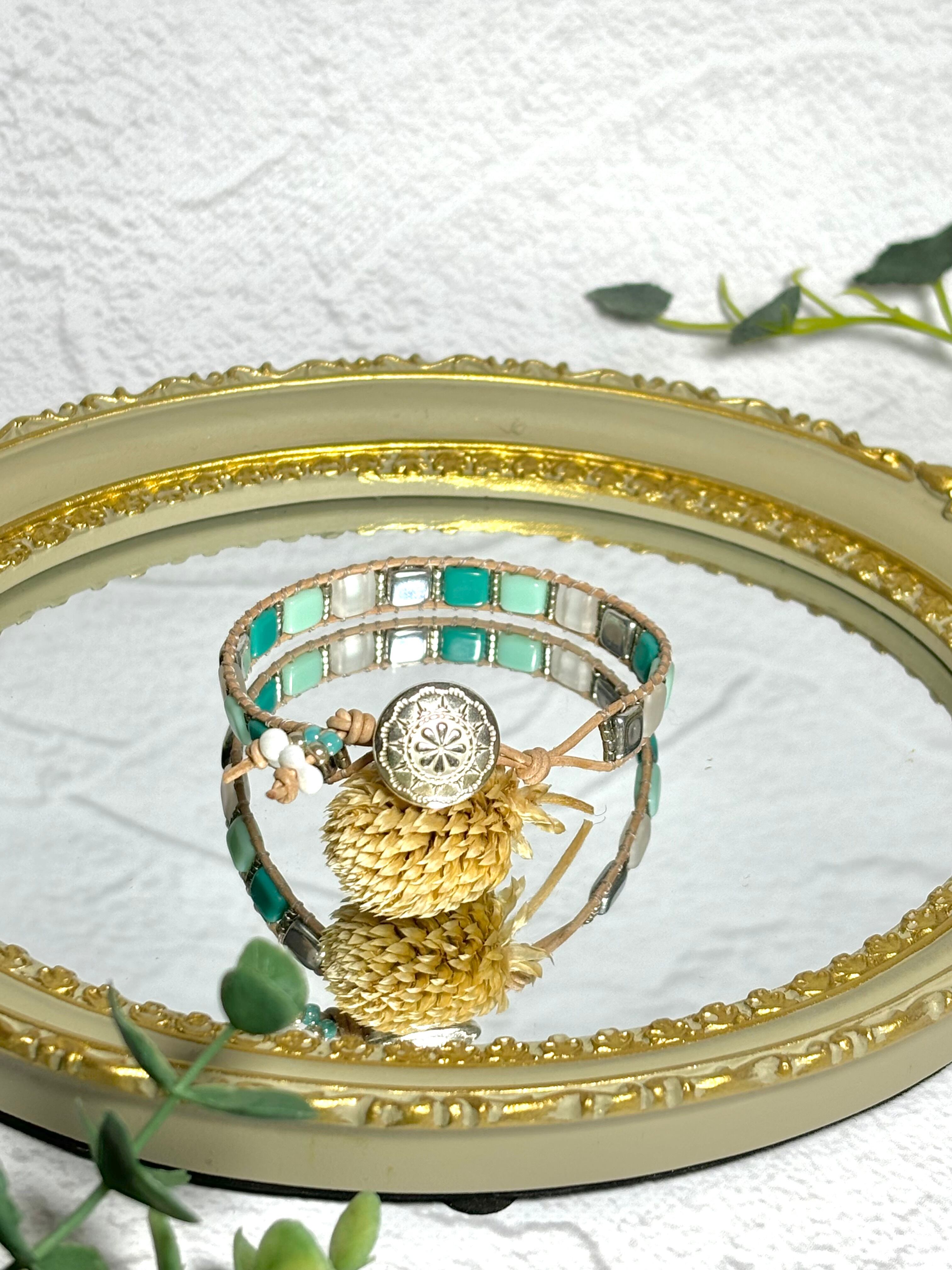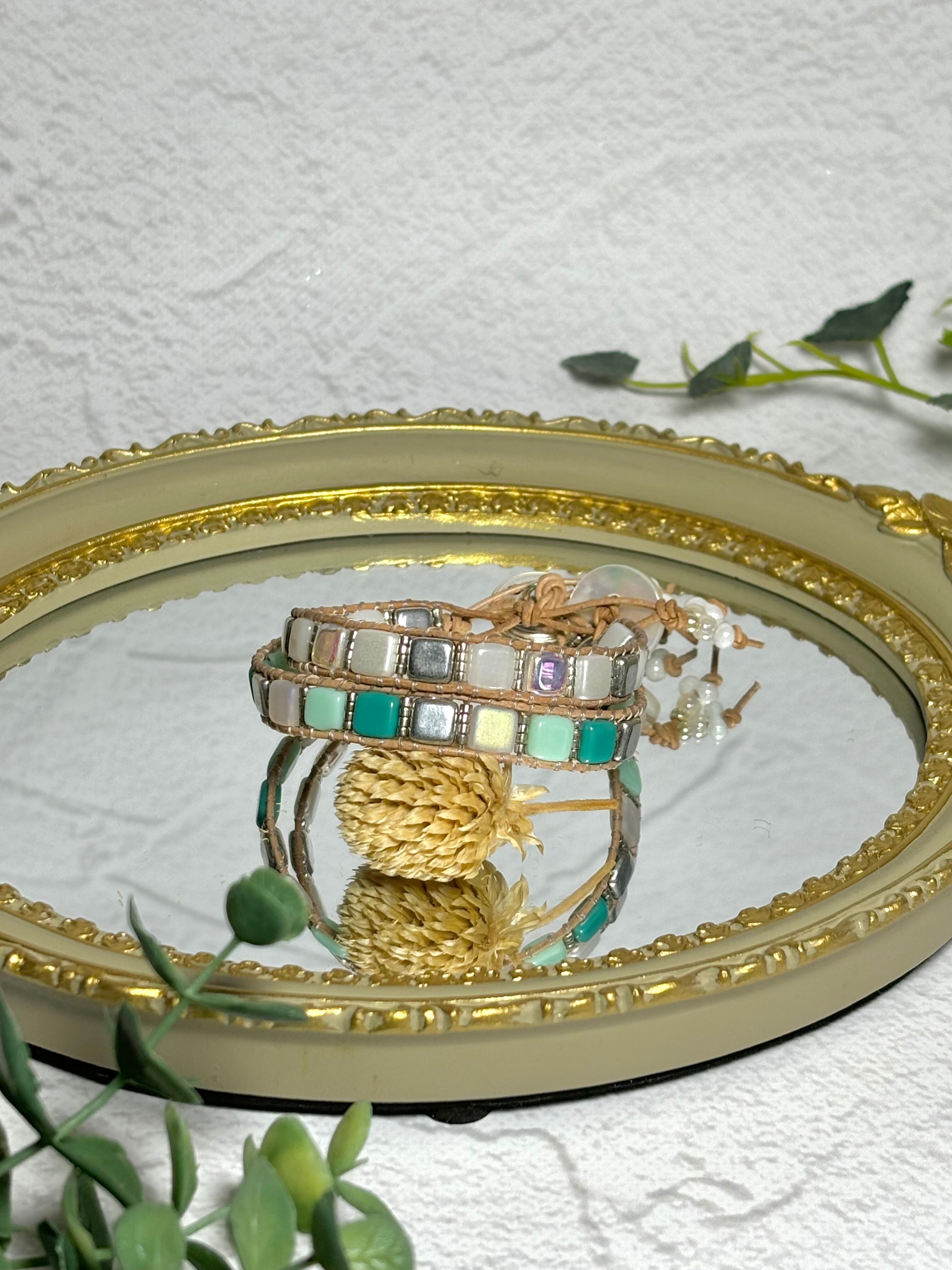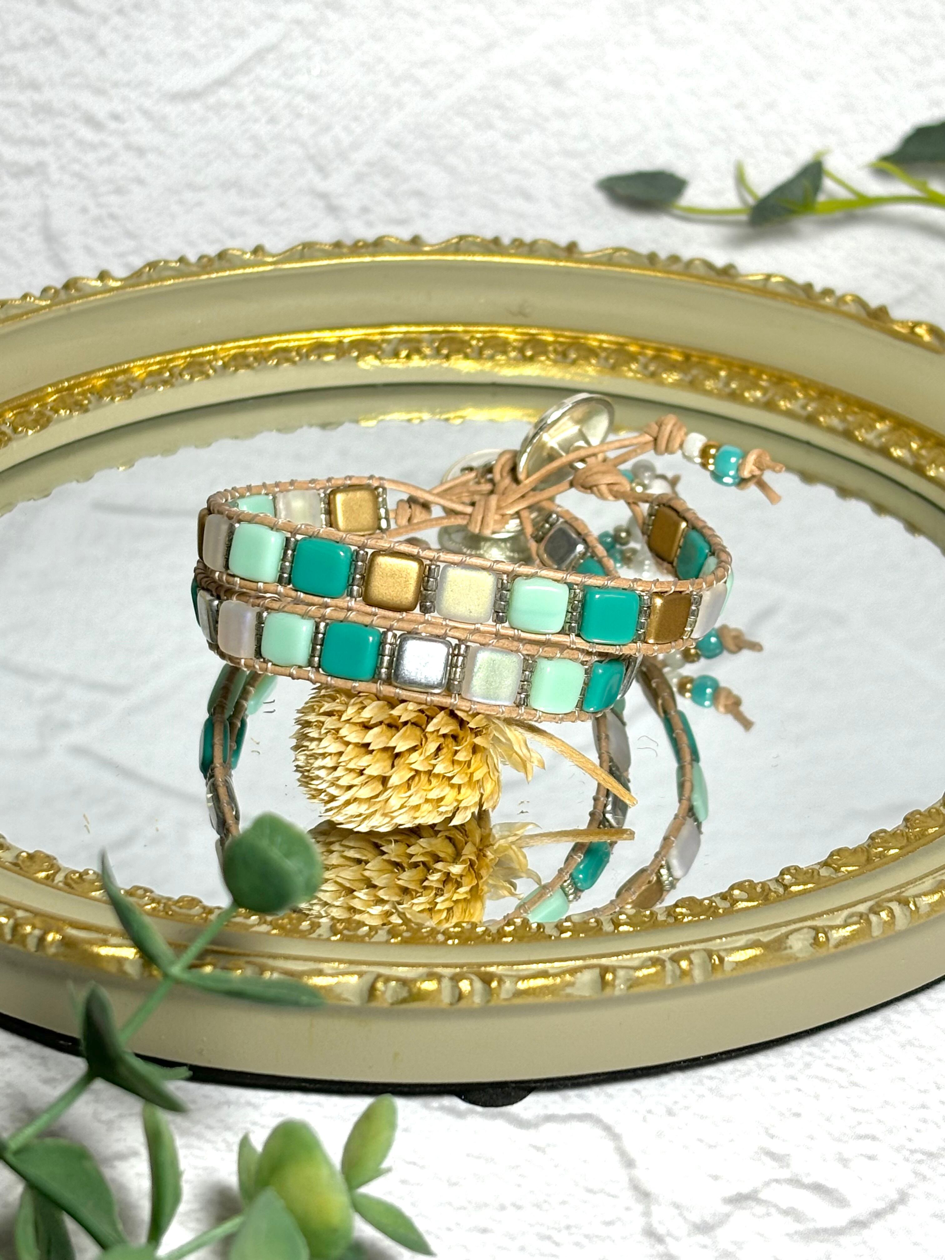 通常の1つ穴のビーズを使ったラップブレスレットに比べて、穴の数が3倍(!)という、手間暇と時間のかかる作品です。